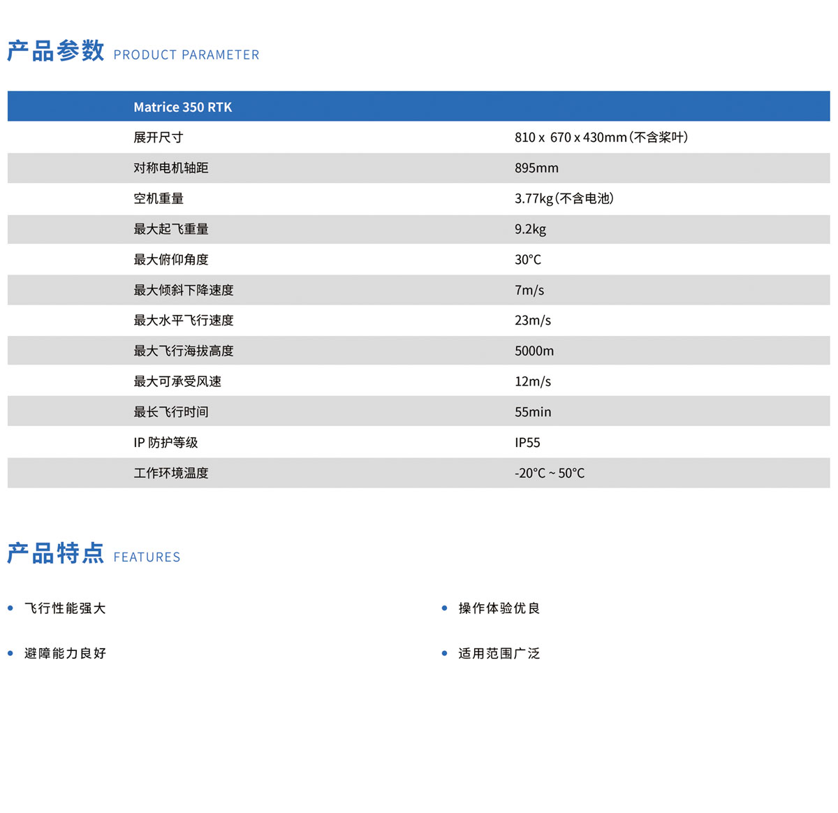 Matrice 350 RTK具備全新圖傳系統(tǒng)和操控體驗,更有效的電池系統(tǒng),更全的安全保障,以及強大的負載和拓展能力,讓飛行平臺滿載實力,為空中作業(yè)注入革新力量。不僅如此,飛行平臺具備IP54等級防護能力,防塵防水,風(fēng)雨無阻,可在-20℃至50℃溫度范圍內(nèi)工作,不懼嚴寒酷暑,實現(xiàn)全天候作業(yè)。