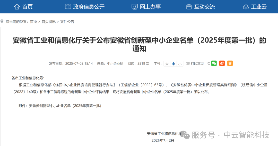 喜報(bào)!中云智能入選安徽省2025年度首批創(chuàng)新型中小企業(yè)?