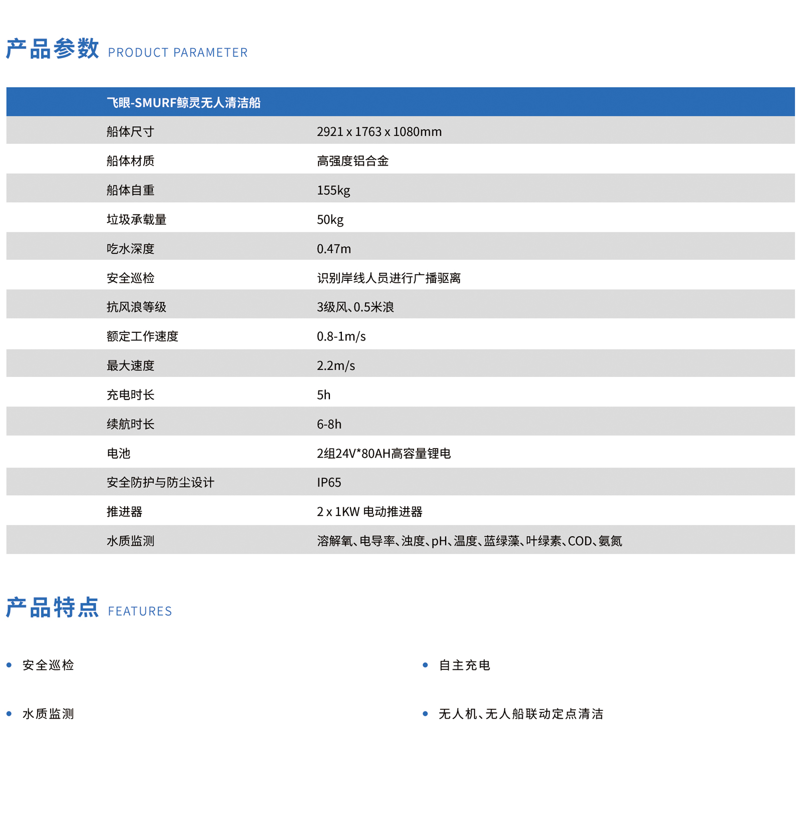 飛眼 -SMURF 鯨靈無人清潔船 24h 在線響應,日常維護水域 50-100畝/船,垃圾承載量 50kg;適用于 10 米以內寬度河道、中小型人工湖、水庫靈活多變。